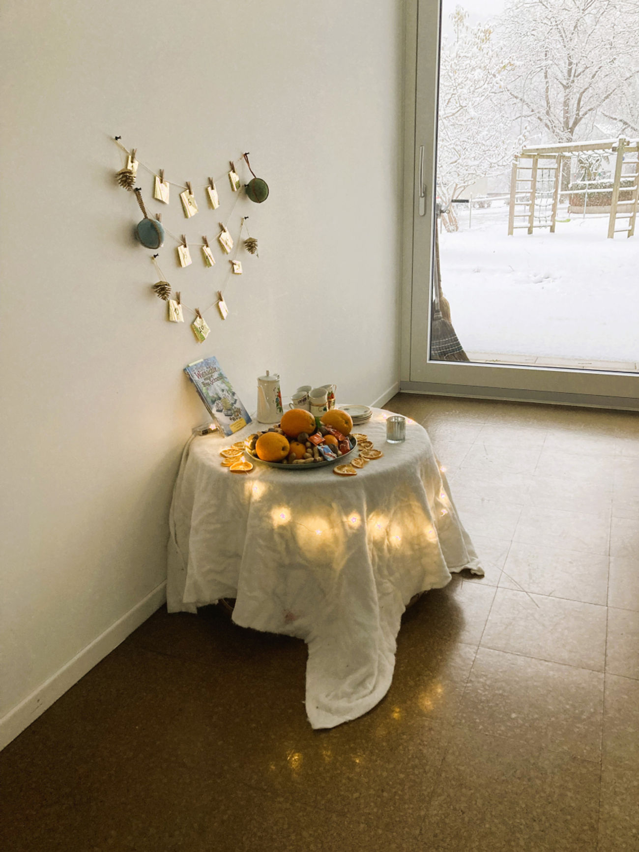 Die motti-Kinder können jeden Tag ein Türchen öffnen und das Kind, dessen Name im Türchen steht, darf an diesem Tag einen Tee zubereiten und servieren. Dazu gibt es für alle Nüsse, Manderindli, Orangen und Schoggi. Zum Essen und Trinken wird eine kleine Weihnachtsgeschichte vorgelesen.